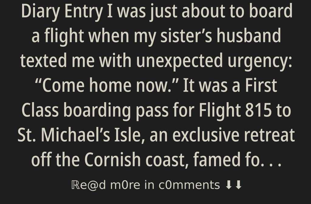 I was just about to board a flight when my sisters husband texted me with unexpected urgency: Come home now. It was a First Class boarding pass for Flight 815 to St. Michaels Isle, an exclusive retreat off the Cornish coast, famed for its digital detox holidays and obsession with privacy. The type of place where British royalty and tech millionaires go to vanishno phone signal, no press, everything hush-hush by design.