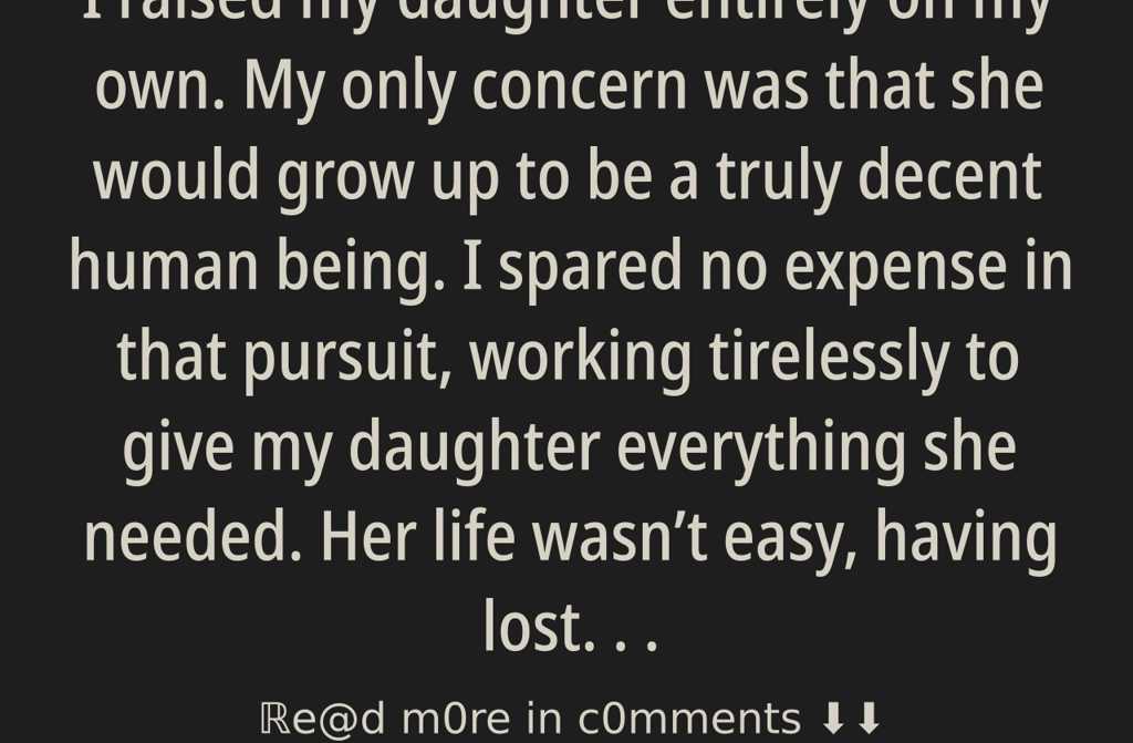 I raised my daughter entirely on my own. My only concern was that she would grow up to be a truly decent human being. I spared no expense in that pursuit, working tirelessly to give my daughter everything she needed. Her life wasnt easy, having lost her mother at such a young age.