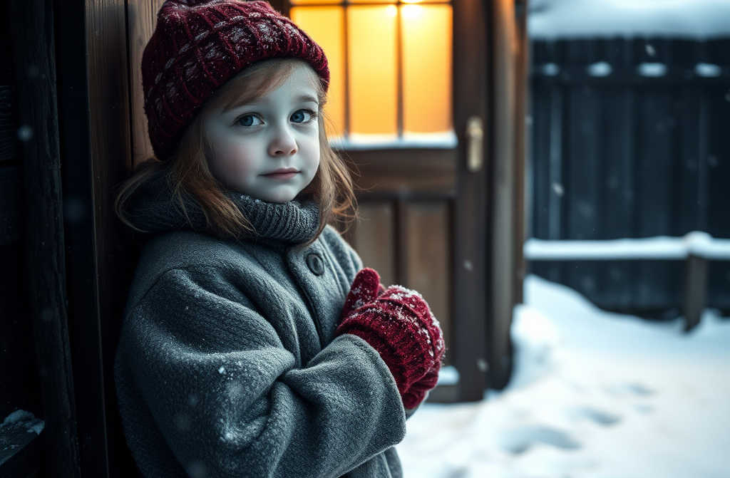 Emily shivered in the cold. She remembered mum always dressing her in cozier clothes for winter walks. The sun had set, and mum never let her out at dusk. She missed her mother terribly the good times with her and the emptiness without. Her lips trembled, and she tried the front door, only to find Id locked it. To keep warm she tried to run around, but the snow, unshoveled for days, clung to her feet. She attempted to roll a snowman, but the powder was too loose, more sand than snow. She wondered if the snow might actually be cold sand. She knocked on the door again, but no one answered, as if shed vanished. Fear rose. She started to cry, calling for me, but I ignored her. Wrapping her arms around herself, she glanced at the slightly ajar garden gate and slipped out, hoping to warm her frozen toes even a little.