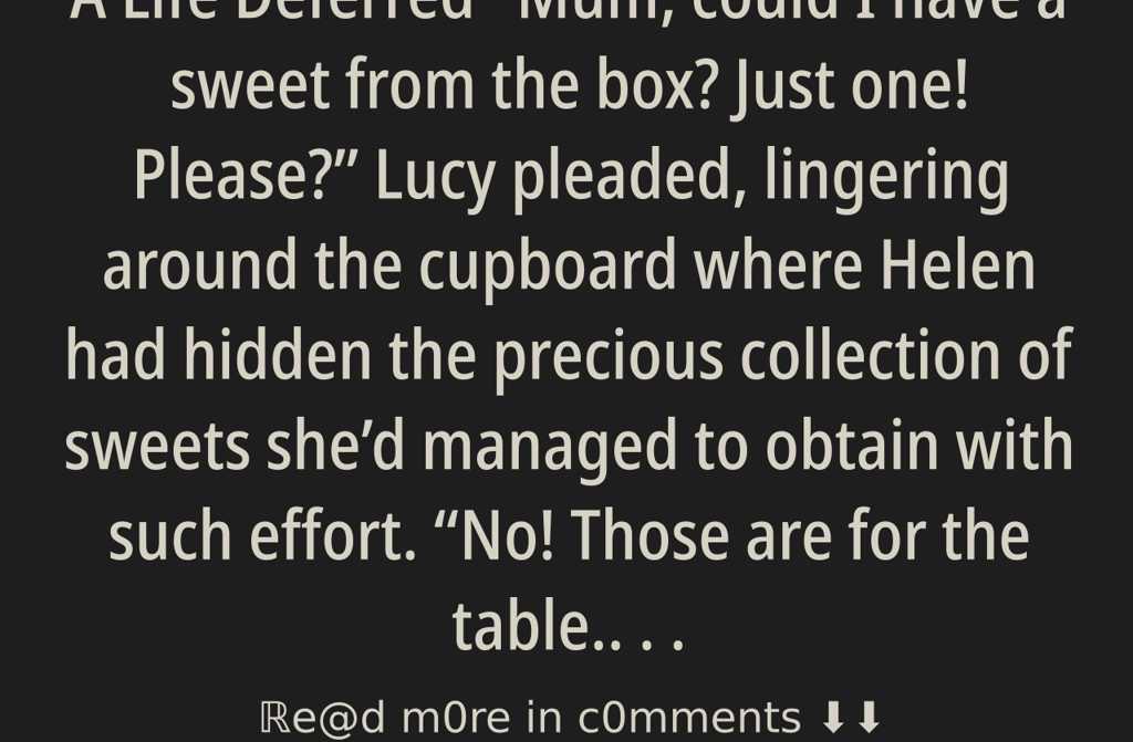 Mum, could I have a sweet from the box? Just one! Please? Lucy pleaded, lingering around the cupboard where Helen had hidden the precious collection of sweets shed managed to obtain with such effort.