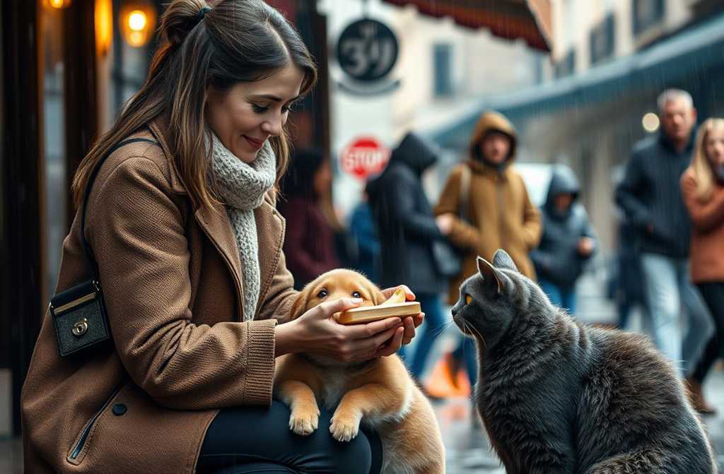 The next day, she brought them food. Somewhere deep inside, she hoped theyd still be there. And they were. The cat mewed happily, the puppy wagged its tail. From then on, she brought breakfast every morning and left something tasty in the evenings.