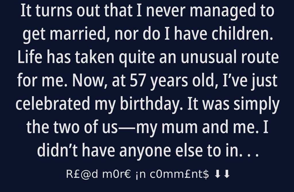 It turns out that I never managed to get married, nor do I have children. Life has taken quite an unusual route for me. Now, at 57 years old, Ive just celebrated my birthday. It was simply the two of usmy mum and me. I didnt have anyone else to invite. I dont have any friends, and mum and I are left without any other family.
