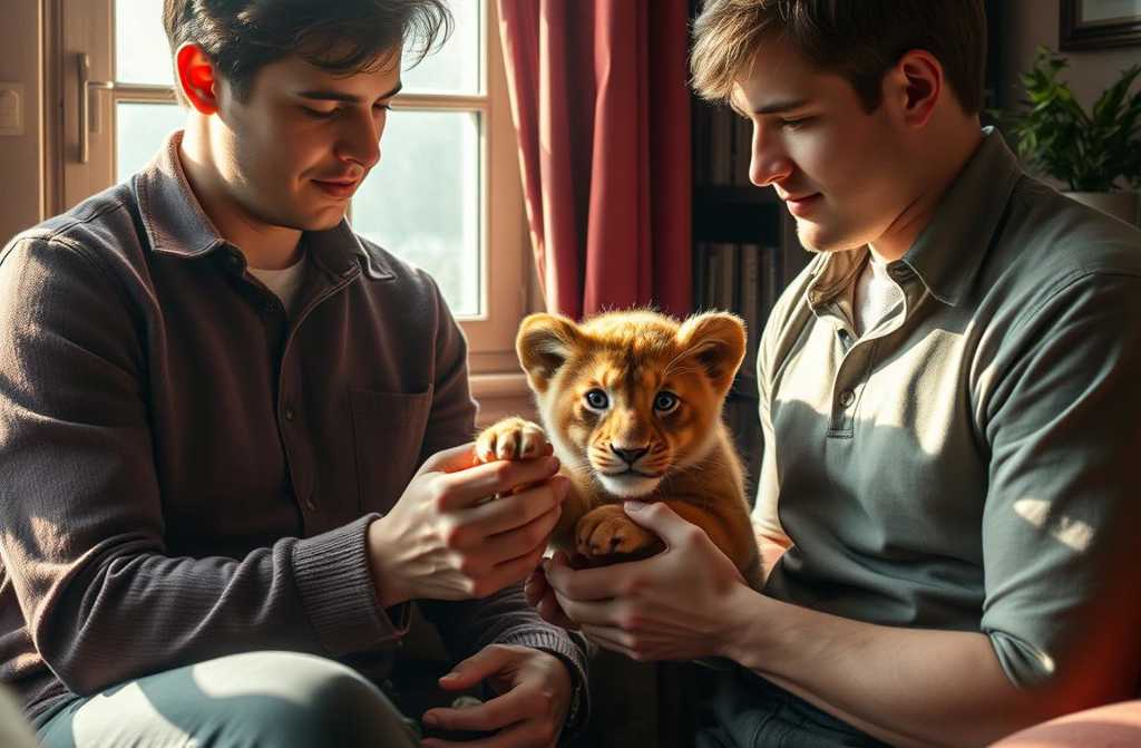 Then, one afternoon, wandering the streets, they stumbled upon a little exotic pet shop. Birds, monkeys, and reptiles peered from the displays, but their eyes locked onto a small cage in the corner. Inside lay a lion cub, no bigger than a kitten, with huge, sorrowful eyes that seemed to understand everything.