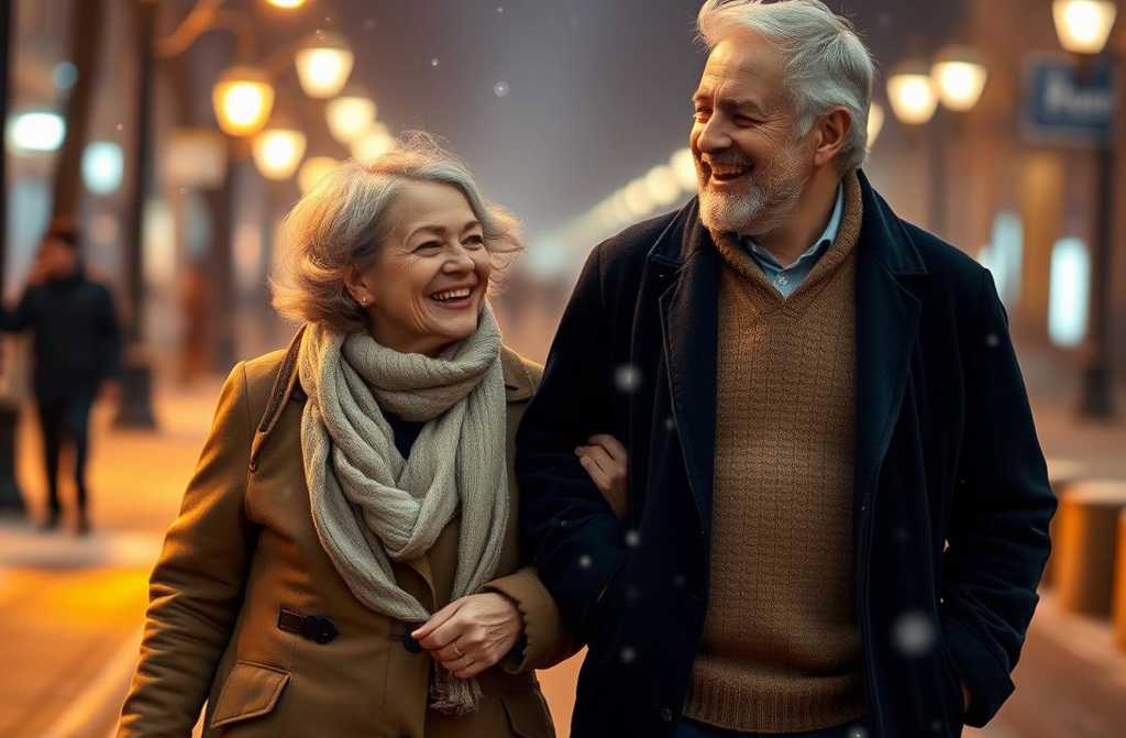 They strolled arm in arm through the softly falling snow, the streetlamps casting a golden glow.