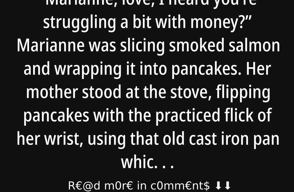 Marianne was slicing smoked salmon and wrapping it into pancakes. Her mother stood at the stove, flipping pancakes with the practiced flick of her wrist, using that old cast iron pan which had done years of service.