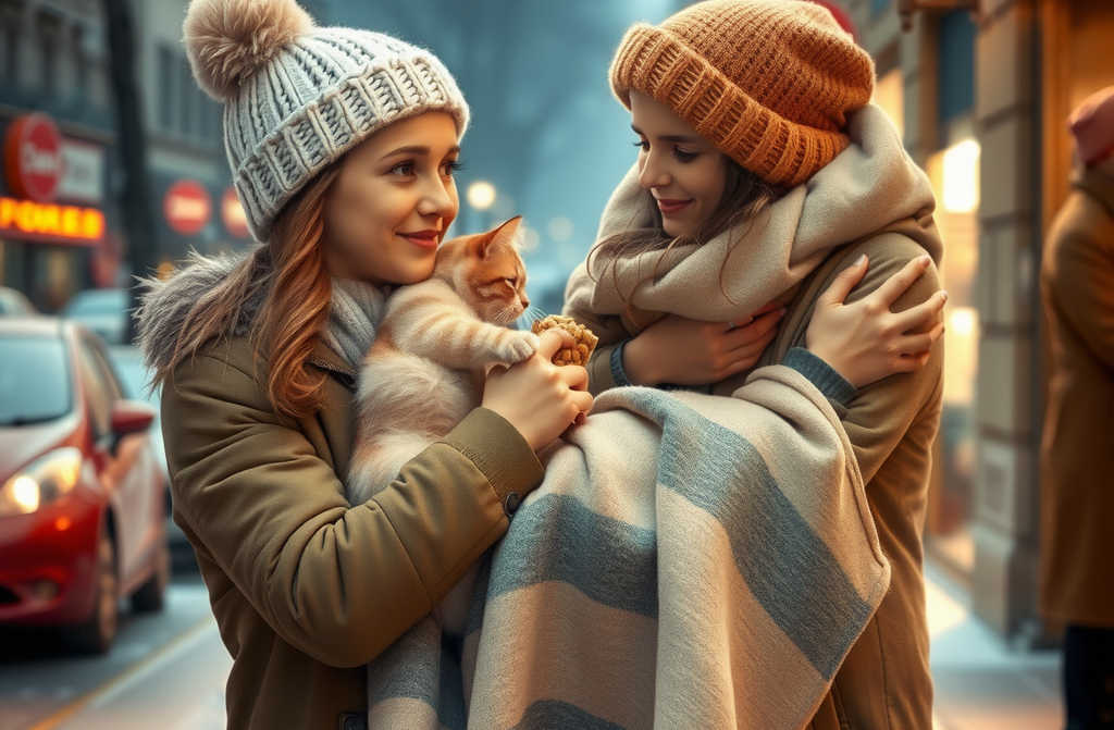 She ducked inside, bought cat food, a warm blanket, mittens, a flask of hot chocolate. Setting them down outside, she gestured for Hope to take them.