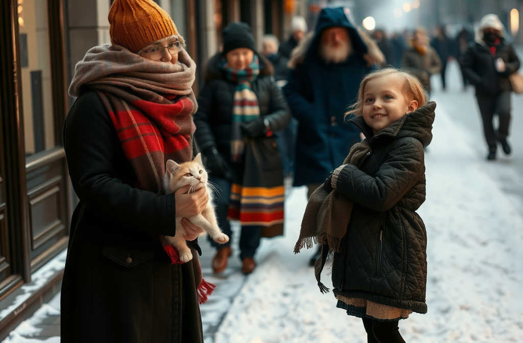 She entered the shop, bought cat food, a warm blanket, mittens, a flask of hot chocolate. Stepping outside, she set the bag beside Hope.