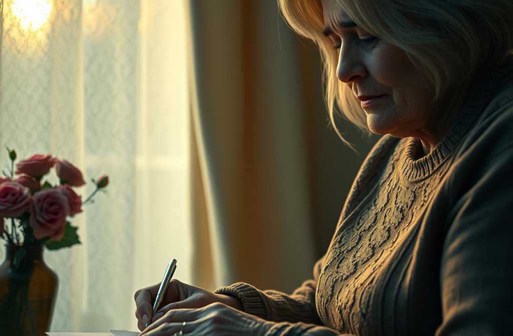 She sat at the table, her fingers trembling slightly as she penned her thoughts.