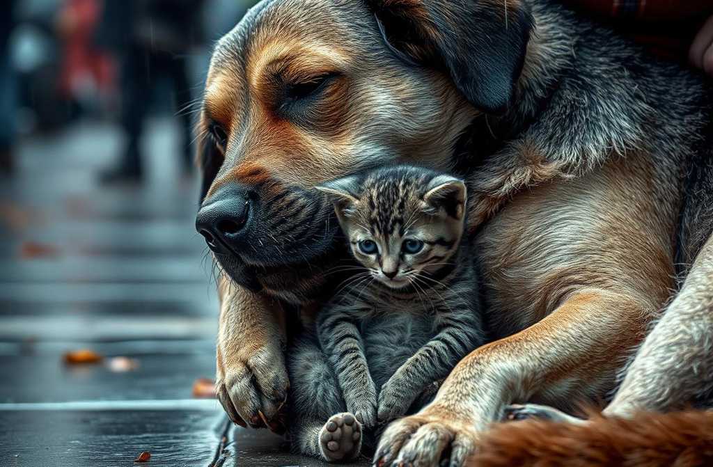 The dog grew thinner. Then autumn came. Endless rain. Dry, warm spots grew scarce. Sometimes the dog curled around his kitten, shielding him from the cold and wet. He shivered, but he licked the little one clean. Keeping him warm and fed was all that mattered.