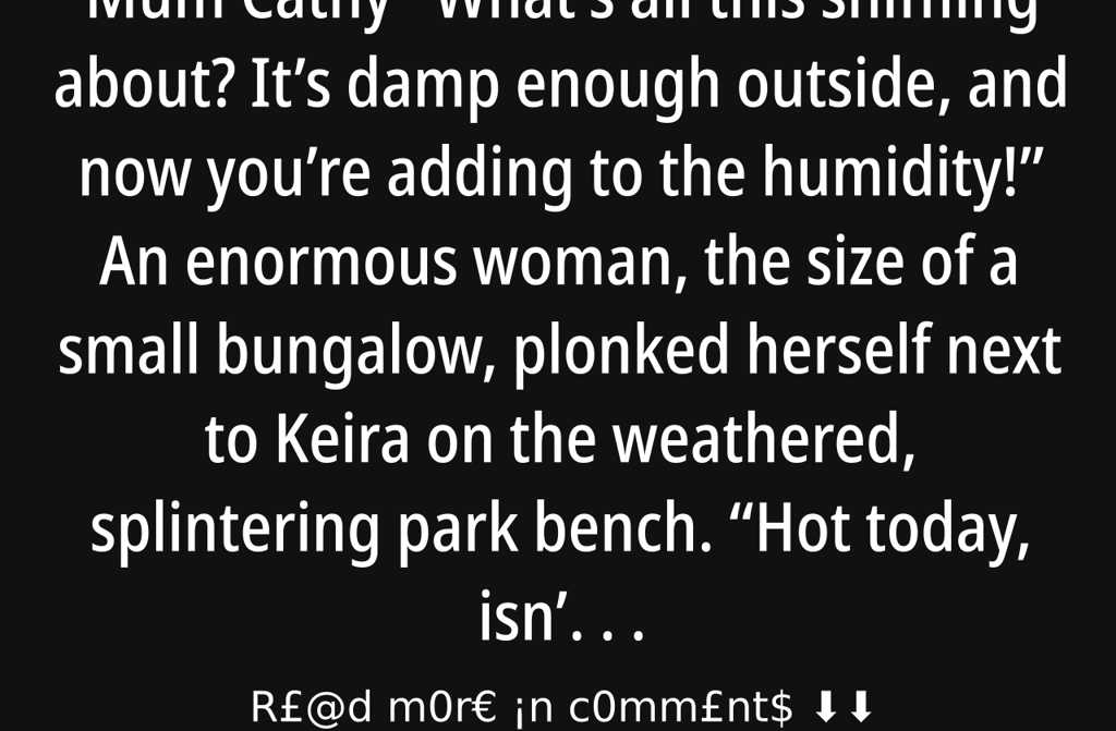 An enormous woman, the size of a small bungalow, plonked herself next to Keira on the weathered, splintering park bench.