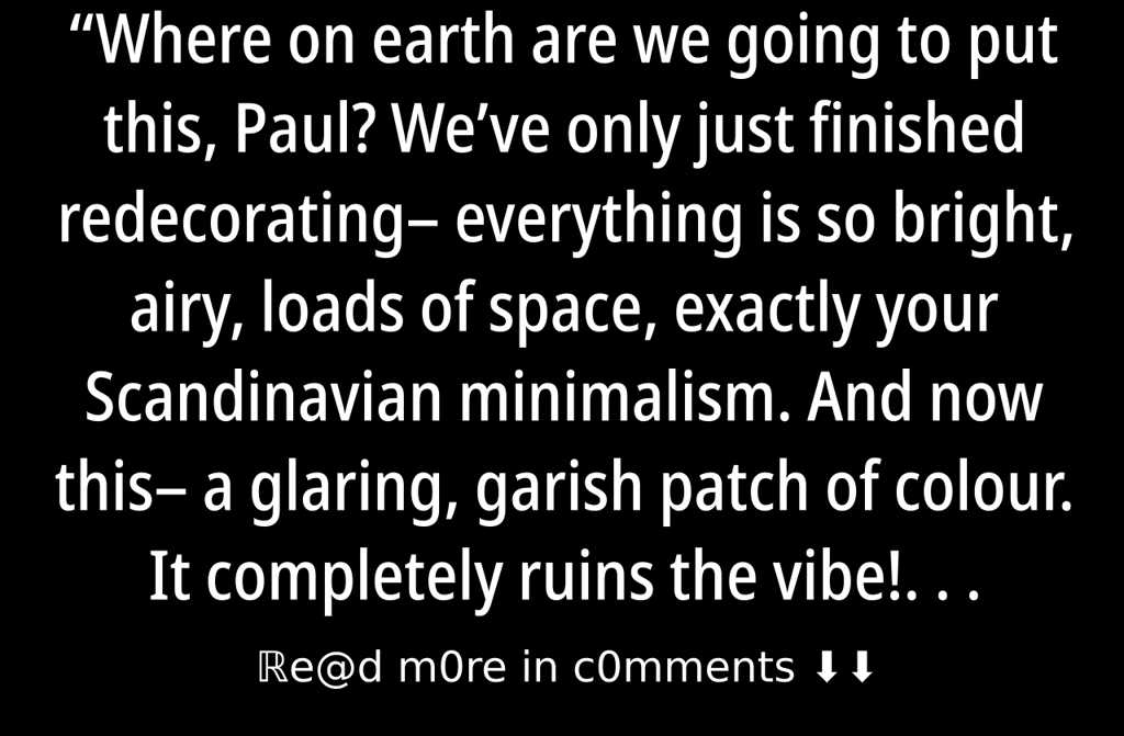 Where on earth are we going to put this, Paul? Weve only just finished redecorating everything is so bright, airy, loads of space, exactly your Scandinavian minimalism. And now this a glaring, garish patch of colour. It completely ruins the vibe!