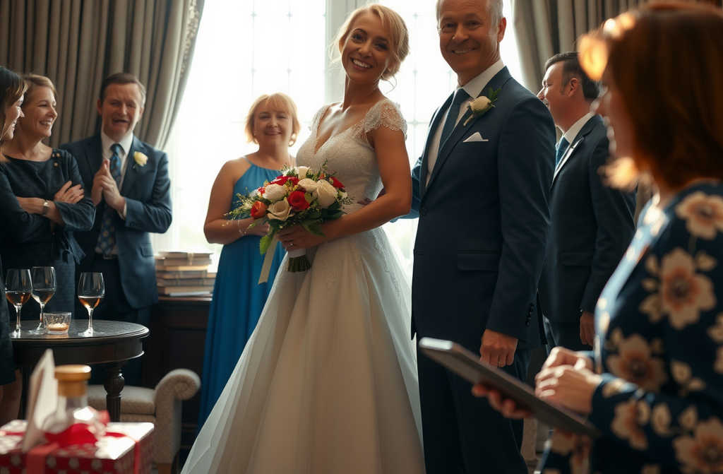On their wedding day, the weather turned out perfect, even though the forecast had said rain was coming. Emma looked absolutely stunning in a silk dress with delicate lace, and James was honestly smittenhe couldnt take his eyes off her all day. Everyone was in high spirits. Their photographer was snapping away nonstop, and the guests couldn’t wait to head to the banquet.