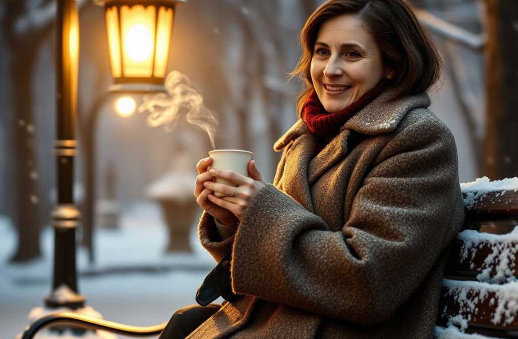 She cradled the steaming cup, her frozen hands warming as the heat spread through her fingers. She sat on a nearby bench under a lamp.