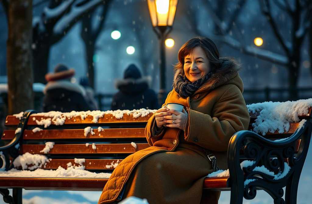 I cradled the steaming cup in my cold hands, feeling heat seep into my fingers. I took a seat on a bench beneath a lamp, watching the snow fall.