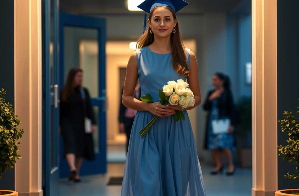 She arrives at the school at half past six. The ceremony starts at seven. Parents crowd the entrance, some snapping photos, some smoking at the side. Emma stands a short distance away, scanning the crowd.