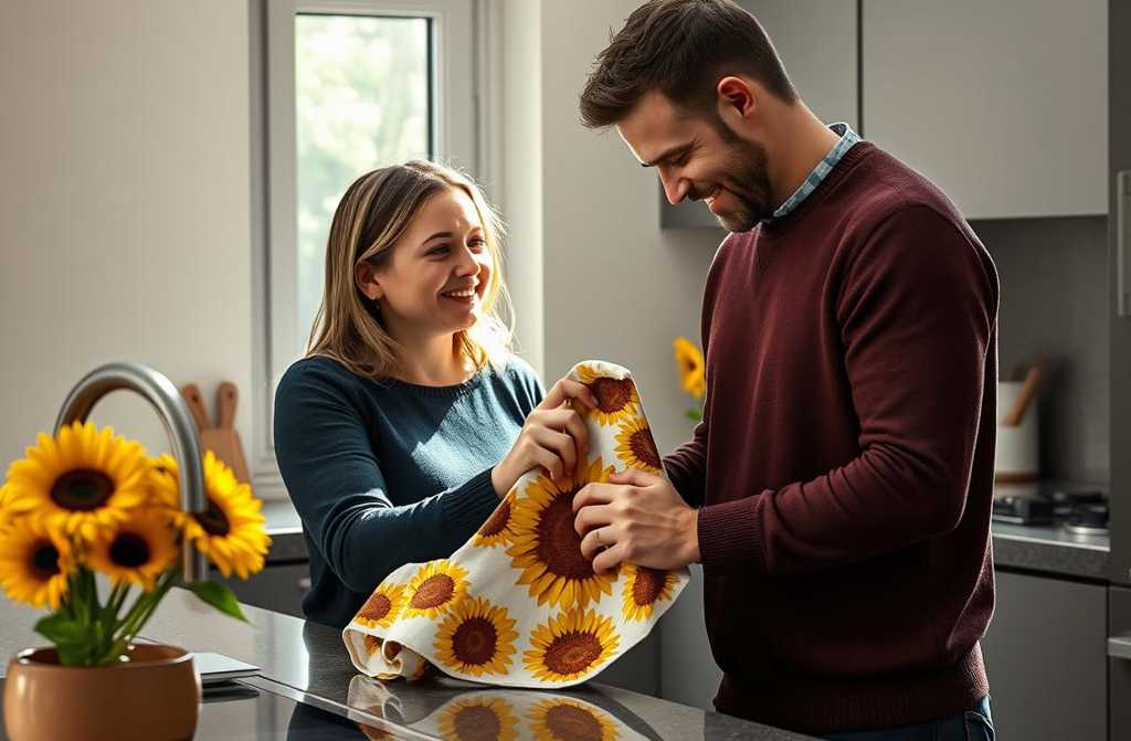 First thing that hits you is colour vivid, blaring, unapologetic. The immaculate stone worktop is now covered with a bright orange tablecloth dotted with oversized sunflowers; the edges hang in uneven waves, hiding the lower drawers.