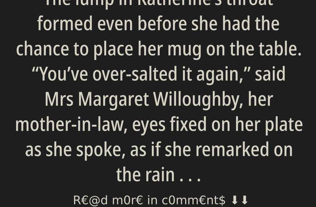 Youve over-salted it again, said Mrs Margaret Willoughby, her mother-in-law, eyes fixed on her plate as she spoke, as if she remarked on the rain outside.