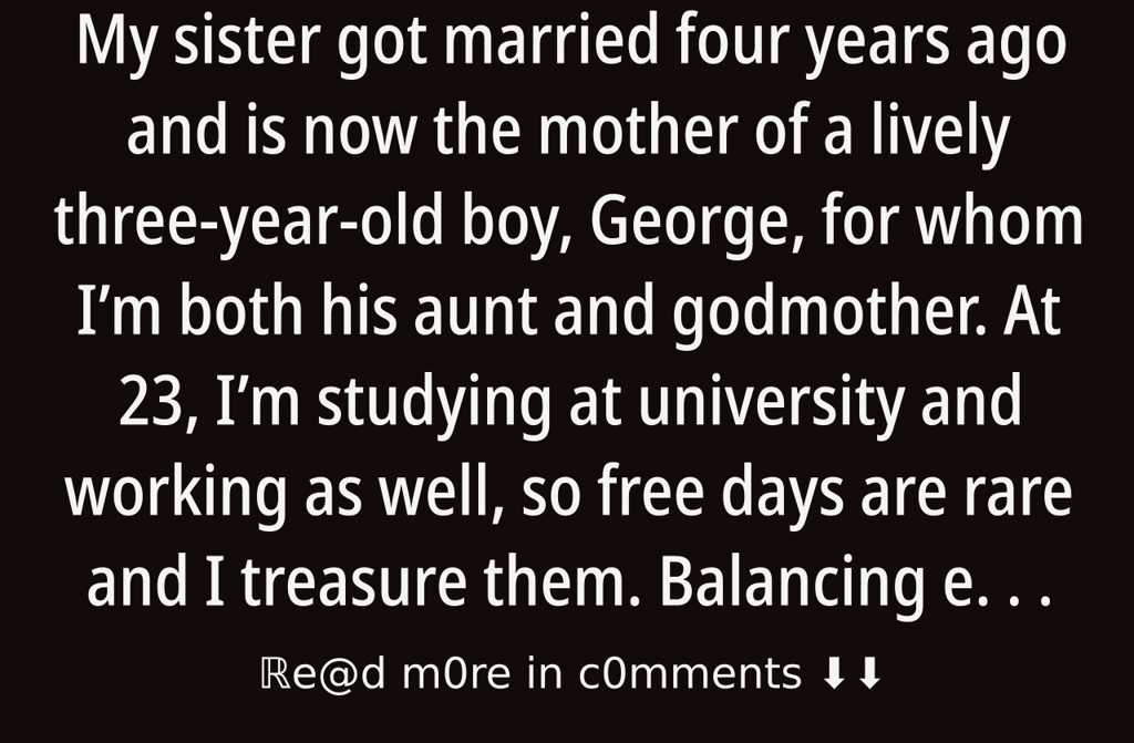 My sister got married four years ago and is now the mother of a lively three-year-old boy, George, for whom Im both his aunt and godmother. At 23, Im studying at university and working as well, so free days are rare and I treasure them. Balancing everything can be tricky, but I always try to make time for my friends and family. Meanwhile, my sister, who is little Georges mum, doesnt have a job at the moment. Despite that, she spends a lot of time at beauty salons, which surprises me, especially since her husband is away on business trips for long stretches.