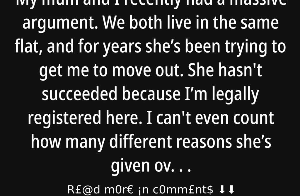 My mum and I recently had a massive argument. We both live in the same flat, and for years shes been trying to get me to move out. She hasn’t succeeded because Im legally registered here. I can’t even count how many different reasons shes given over time. And I just wanted to keep a good relationship with my family.
