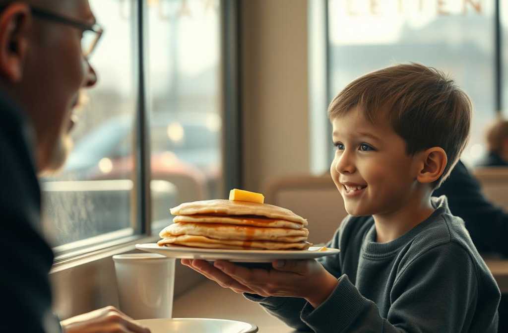 I heard him say, clear as the bell above the door: “Are you hungry, mister? You can have my pancakes if you like.”