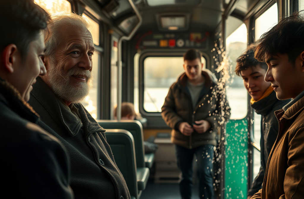 Suddenly, the cabin lights blazed. The conductor returned, stamping her feet, arms full but instead of a weapon, she carried mops and a bucket. Setting them beside the shivering lads, she beamed.