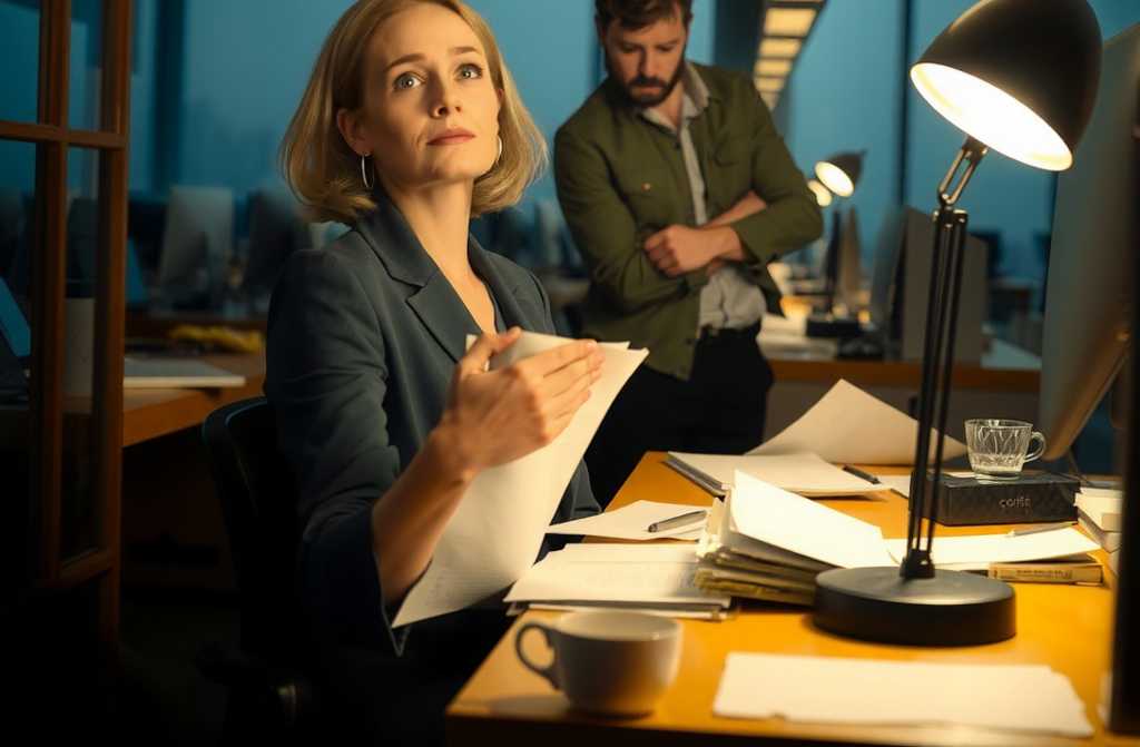 The next day, business as usual. Alice returned to chilly morning hellos, the whir of ancient radiators, and James pretending nothing had happened. There he was, lobbing in accidental desk visits and forced banter, but she kept interactions strictly business, wearing her trademark British frostiness.