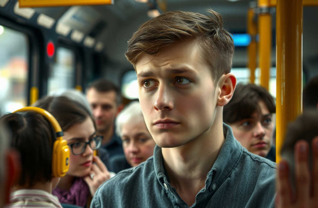 At the next stop, a woman boarded with two small children clinging to her sides, the youngest squeezing her hand tightly. Not a single seat remained. Glancing around, the woman hastily fixed her gaze upon the young man. Without hesitation and thinly veiling her annoyance, she strode over to him.