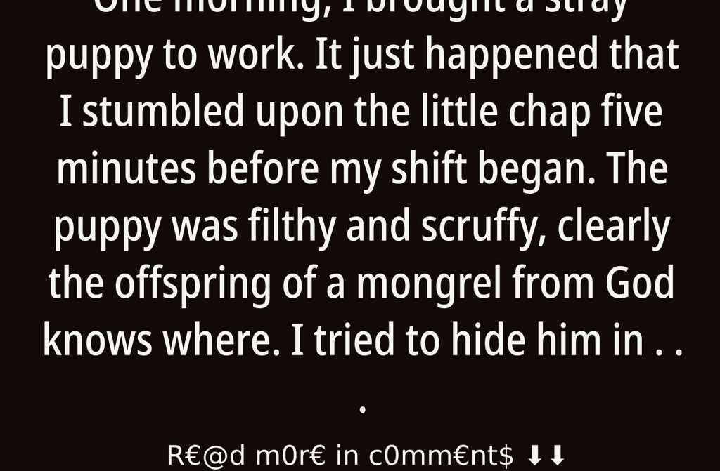 One morning, I brought a stray puppy to work. It just happened that I stumbled upon the little chap five minutes before my shift began. The puppy was filthy and scruffy, clearly the offspring of a mongrel from God knows where. I tried to hide him in the corner of my office, but he kept crawling out and letting out these desperate little whimpers. In the end, it didnt take long before he was spotted by every single one of my colleagues.
