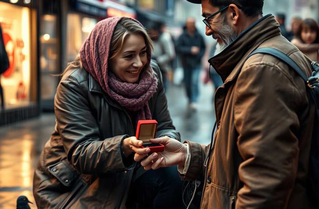 The sky drizzled softlylike a delicate curtain of rainas people hurried by with umbrellas open and eyes downcast. Yet no one noticed the woman in a beige suit kneeling in the middle of the crossing, her voice trembling. *”Please marry me,”* she whispered, clutching a velvet box. The man she was proposing to? Unshaven for weeks, wearing a taped-up coat, sleeping in an alley just a block from the City.