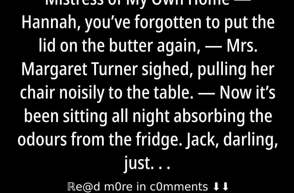 Hannah, youve forgotten to put the lid on the butter again, Mrs. Margaret Turner sighed, pulling her chair noisily to the table. Now its been sitting all night absorbing the odours from the fridge. Jack, darling, just have some cream cheese instead, I picked up a fresh tub yesterday.