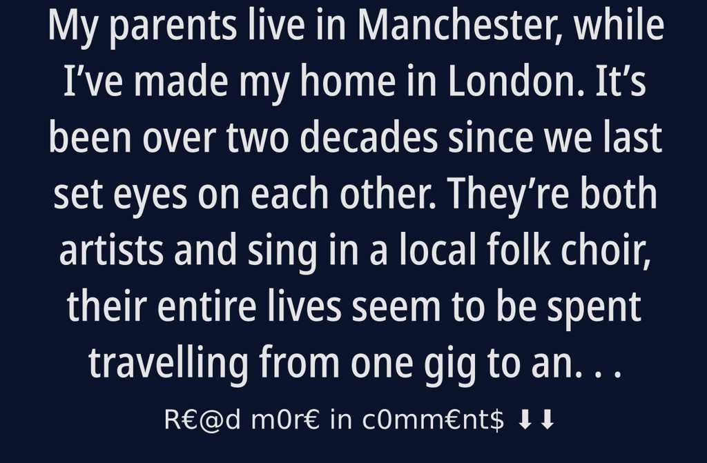 Its been over two decades since we last set eyes on each other. Theyre both artists and sing in a local folk choir, their entire lives seem to be spent travelling from one gig to another. When I turned five, I was sent to live with my nan. To make things a bit easier, she had to move in with family up in Yorkshire. In the early days, my mum and dad would visit twice, maybe three times a year, but with time those visits faded into almost nothing. Eventually, I stopped thinking about them at all. Our communication just fizzled out to nothing. When I was in medical school, I ended up marrying in my third year.