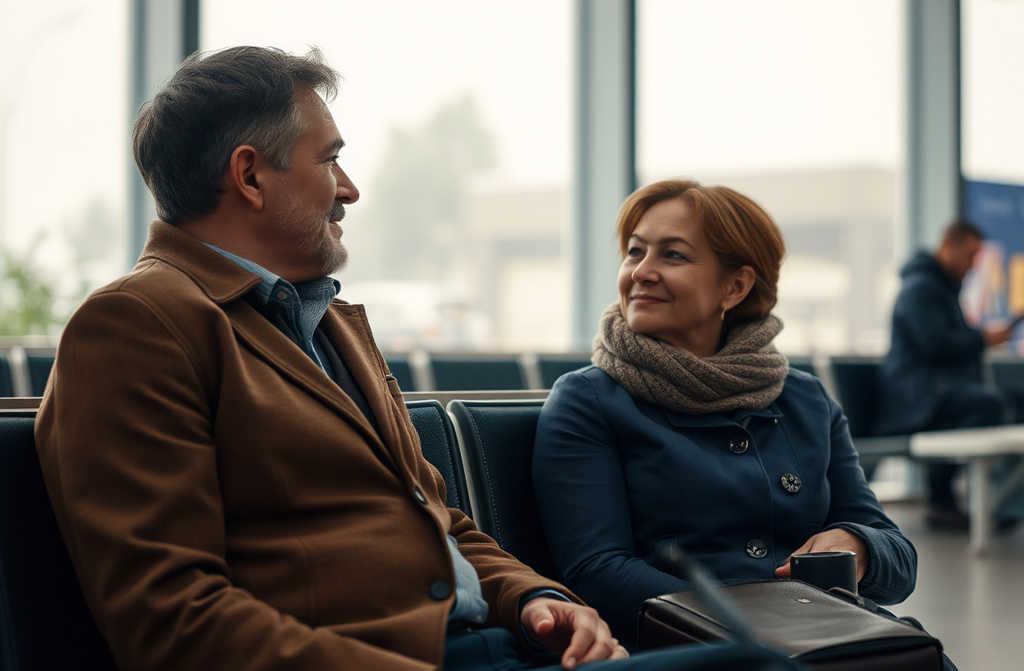 In the airport lounge, he sat beside her, while the kids pressed against the huge glass, watching planes take off.