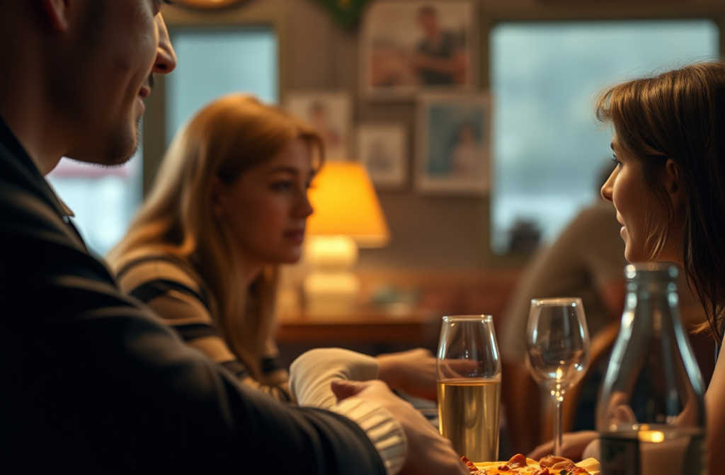 The pizzeria was bright, noisy, and entirely different from the cozy little bistro they remembered; neon signs blazed, music blared. Ian fidgeted with a napkin, eyes scanning the menu for familiar wording. The Ham & Mushrooms pizza was listed under a different name. He hesitated.