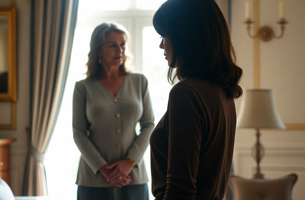 At seven they stand before Evelyns front door. She opens immediately, elegant in an expensive suit, nothing betraying the recent clash.