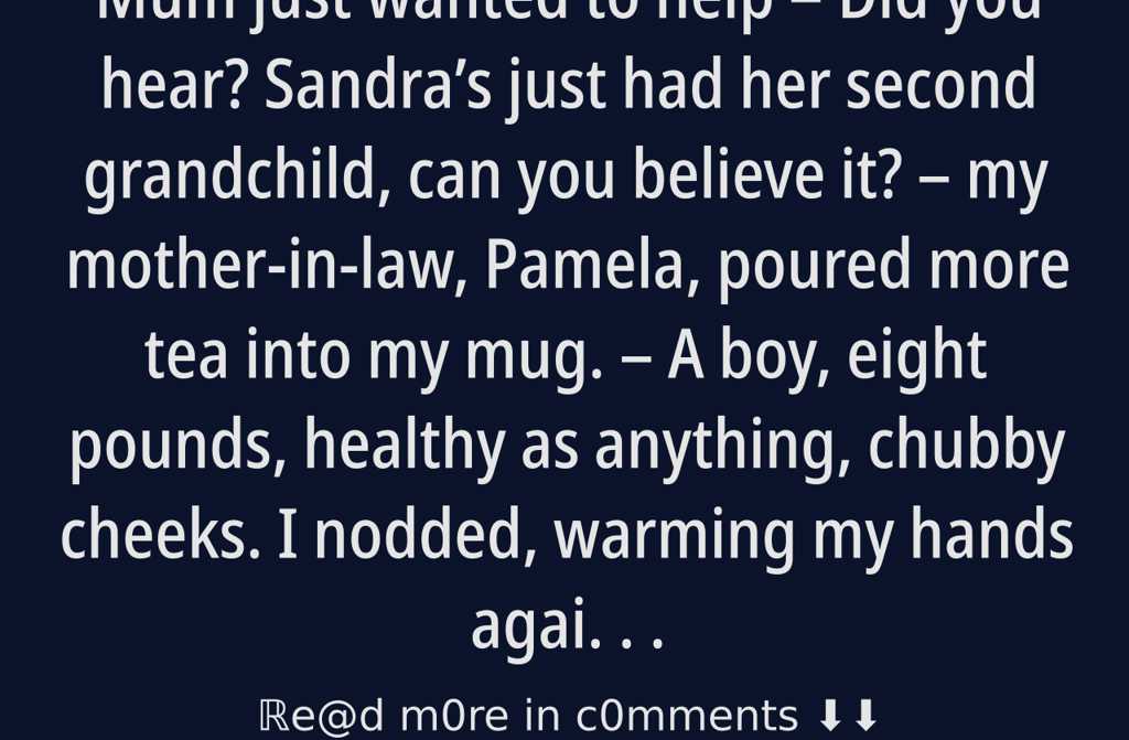 Did you hear? Sandras just had her second grandchild, can you believe it? my mother-in-law, Pamela, poured more tea into my mug. A boy, eight pounds, healthy as anything, chubby cheeks.