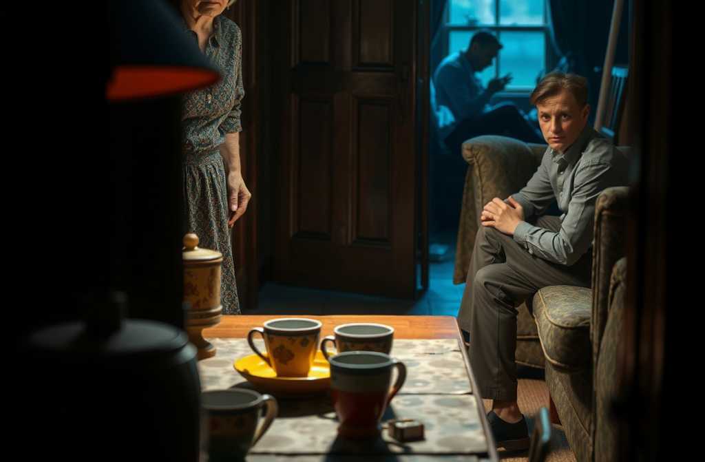 Margaret Pratchett, 68 years old, stood beside the half-open door of her own bedroom, holding two mugs of tea that had cooled some time ago. The hallway was edged with evening blue, as if the whole house was slowly drowning in a landscape of smudgy watercolours.