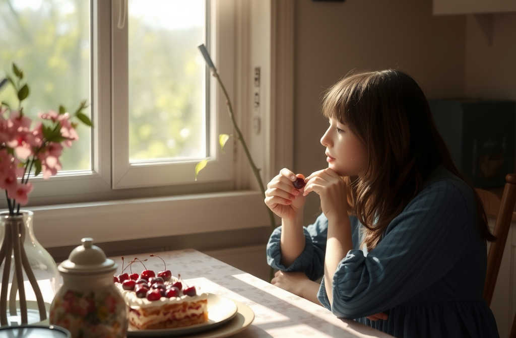 She stepped into the lounge, looked at the table, the meat, the salads, the fresh bread, the untouched plate laid for her. She sat at the kitchen table this time, her portion in front of her, and beside it, a slice of her own cherry sponge. Poured herself a hot cup of tea.