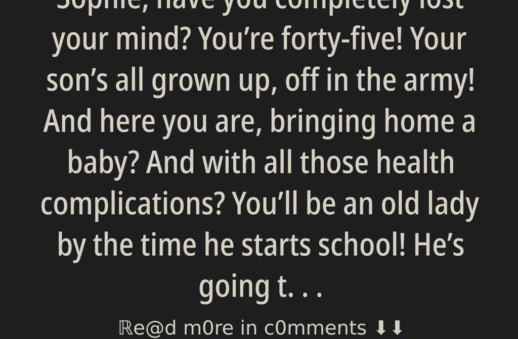 Sophie, have you completely lost your mind? Youre forty-five! Your sons all grown up, off in the army! And here you are, bringing home a baby? And with all those health complications? Youll be an old lady by the time he starts school! Hes going to wear you out and put you in an early grave!