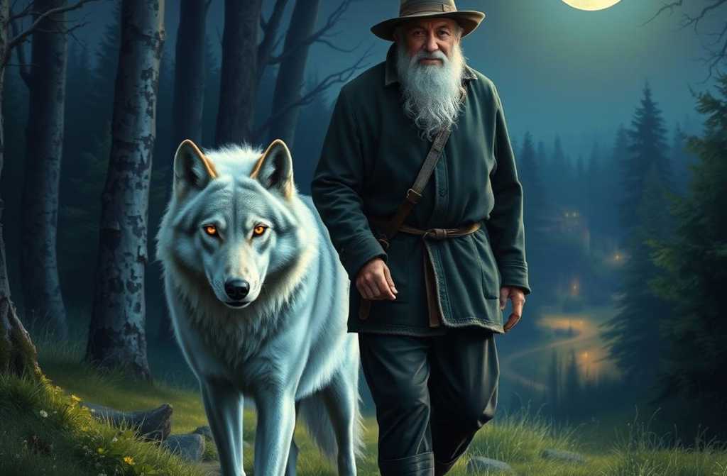 After a few miles, light appeared aheada village. People rushed out at the sound of barking and gasped at the sight: a great wolf gently laying an old man, weak but alive, at their doorstep.