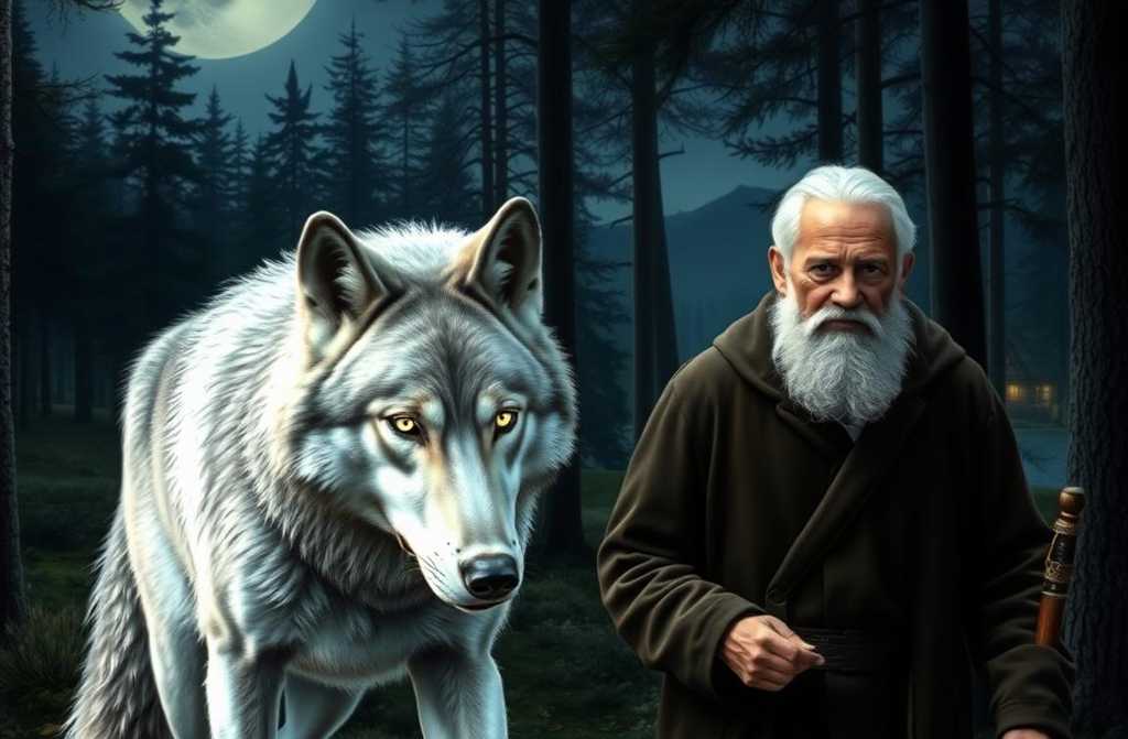 After some miles, a light appeared ahead: a village. Hearing barks, people rushed out and saw the unbelievablean enormous wolf gently laying an old man, weak but alive, at their gates.