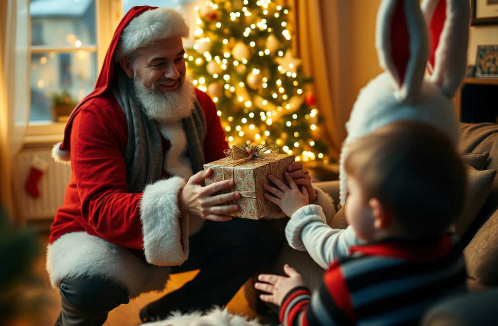 Off we went, me lugging the present sack behind Dad in full Father Christmas gear. Mum was barely holding in laughter as she saw me bouncing along, ears flapping, beside tall Father Christmas and the clattering staff.
