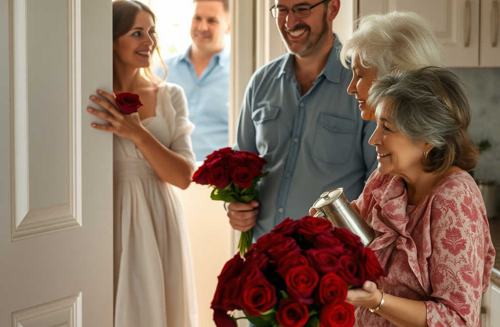 Simon stood on the stairwell, looking almost cinematic. In one hand he clutched an enormous bouquet of burgundy roses wrapped in crinkly craft paper. He wore a new coat that hung a little loosely and a scarf tossed casually over his shoulder, as if rehearsing his entrance.