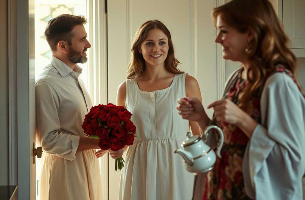 Simon stood in the landing, looking straight out of a film. He clutched an enormous bouquet of burgundy roses wrapped in crinkly kraft paper, wore a new coat that hung a little loosely, and a scarf tossed over his shoulder. Hed clearly rehearsed his entrance, his smile wide and mischievous the kind that used to melt me every time.