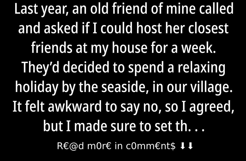 Last year, an old friend of mine called and asked if I could host her closest friends at my house for a week. Theyd decided to spend a relaxing holiday by the seaside, in our village. It felt awkward to say no, so I agreed, but I made sure to set things straight from the beginning: