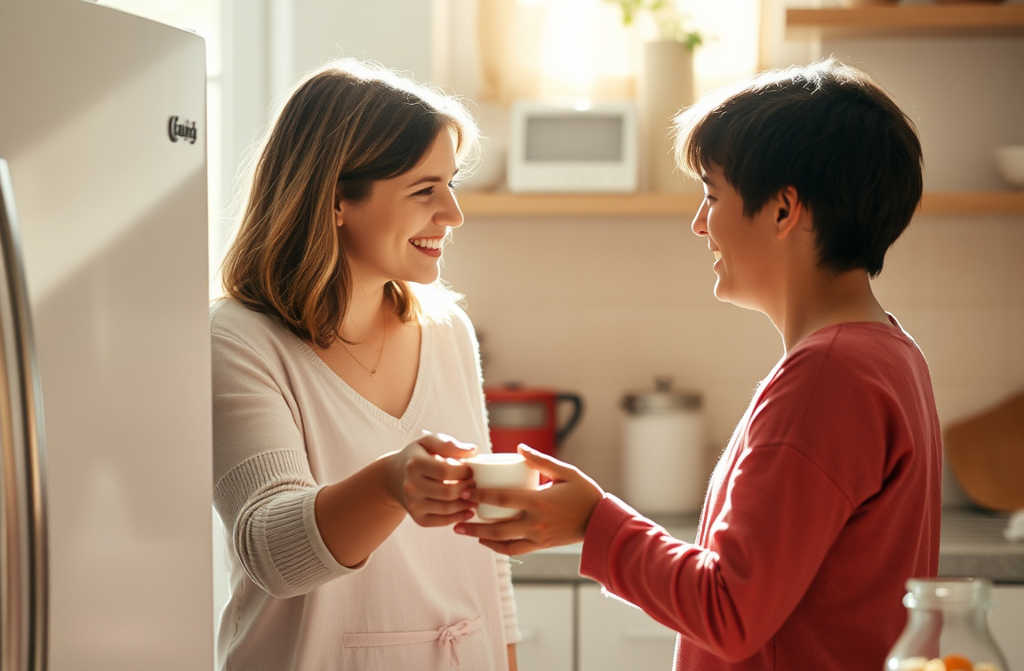 Wheres the milk? Emily rummaged through the fridge, pulling toward a white carton with bold red lettering. Found it! Lets make some pancakes