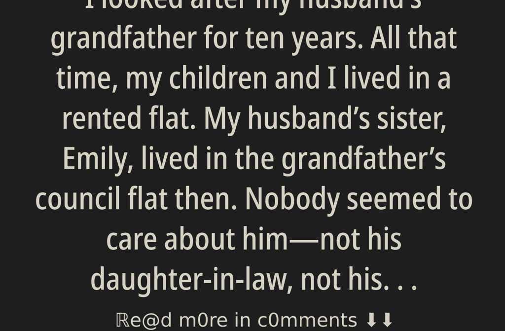 I looked after my husbands grandfather for ten years. All that time, my children and I lived in a rented flat. My husbands sister, Emily, lived in the grandfathers council flat then. Nobody seemed to care about himnot his daughter-in-law, not his grandchildren. My own life hadnt gone as I had hoped: I never finished university because I fell pregnant and never managed to build a proper career.