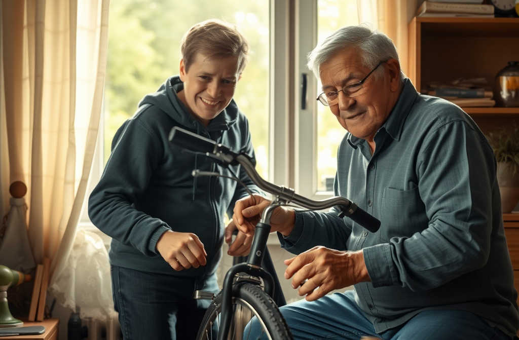 I set the bike on its side, propping a rag under the pedal. Dad crouched down slowly, knees creaking, and I pretended not to notice.