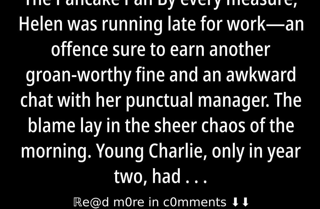 By every measure, Helen was running late for workan offence sure to earn another groan-worthy fine and an awkward chat with her punctual manager. The blame lay in the sheer chaos of the morning. Young Charlie, only in year two, had turned up his nose at his porridge and whinged about a sore throat. Squinting through her spectacles, Helen tried to spot the faintest trace of redness, but upon realising he was putting it on, she threatened a swift smack and stuffed his school bag onto his shoulders.