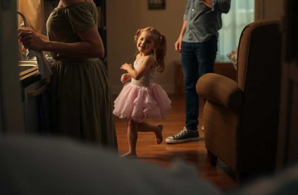 Emily doesnt hesitate. She grabs the nearest thinga sofa cushionand hurls it at Tom’s retreating figure. It just bounces off, doing no harm save a small bruise to his pride. Tom opens his mouth, likely to fire back a quip, but just then Daisy appears in the doorway, in a pink frilly dress.