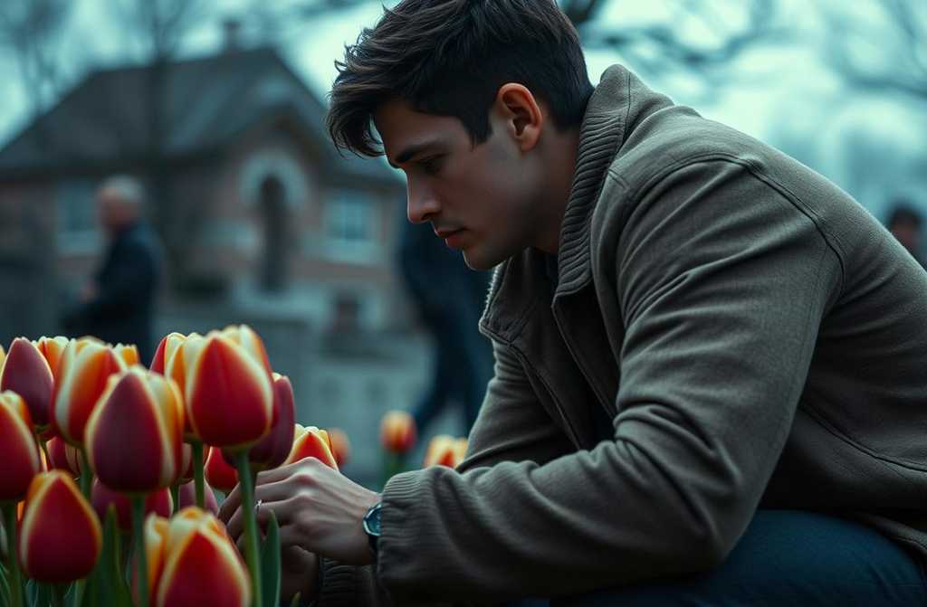 A cab pulled up outside the cemetery gates. A young man stepped out and approached the woman selling flowers by the entrance.